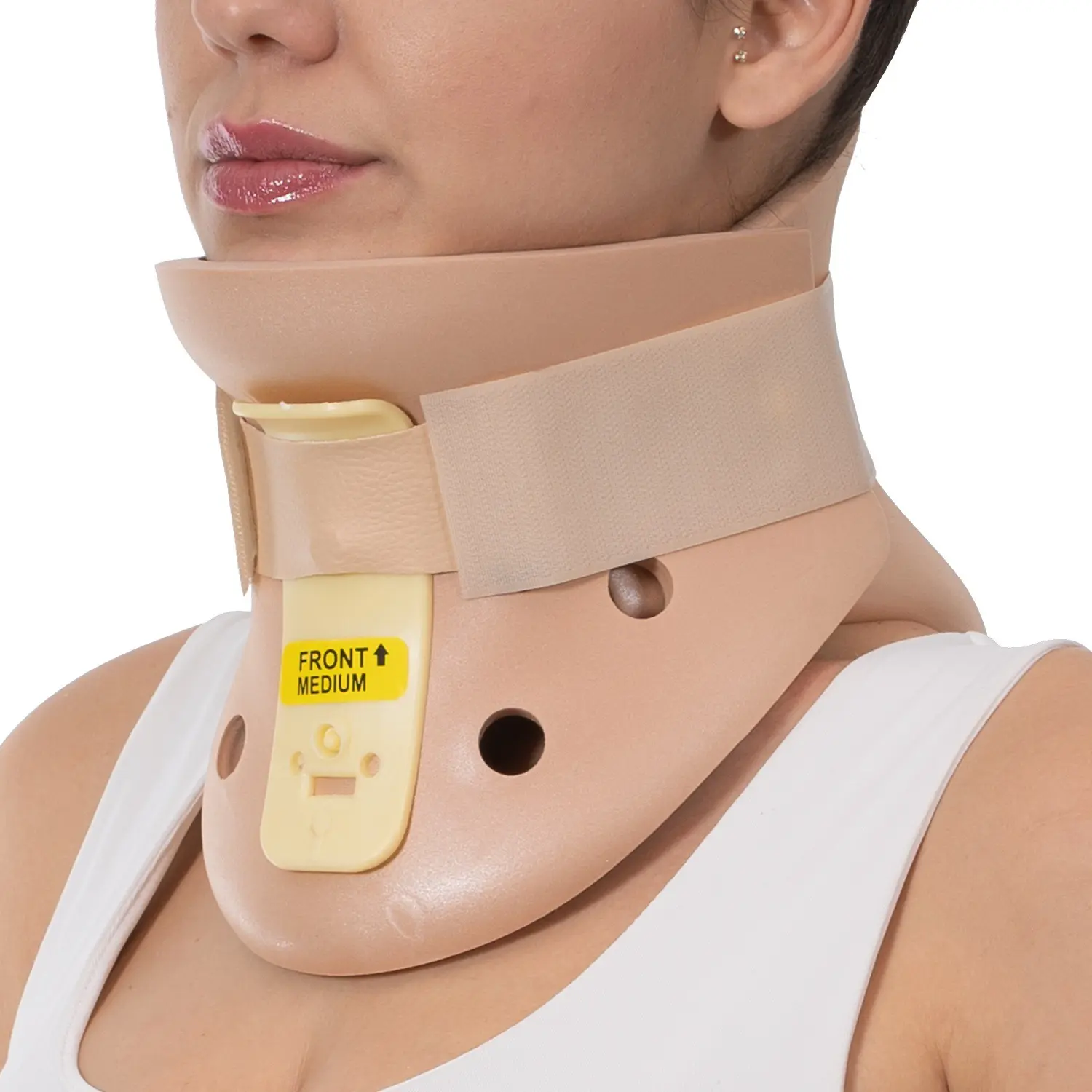 - İki parçalı sert yapı, servikal bölgeyi çevreleyerek dengeli ve güçlü stabilizasyon sağlar.